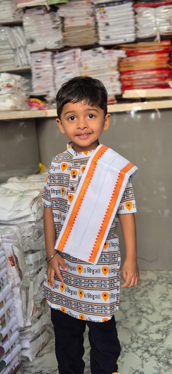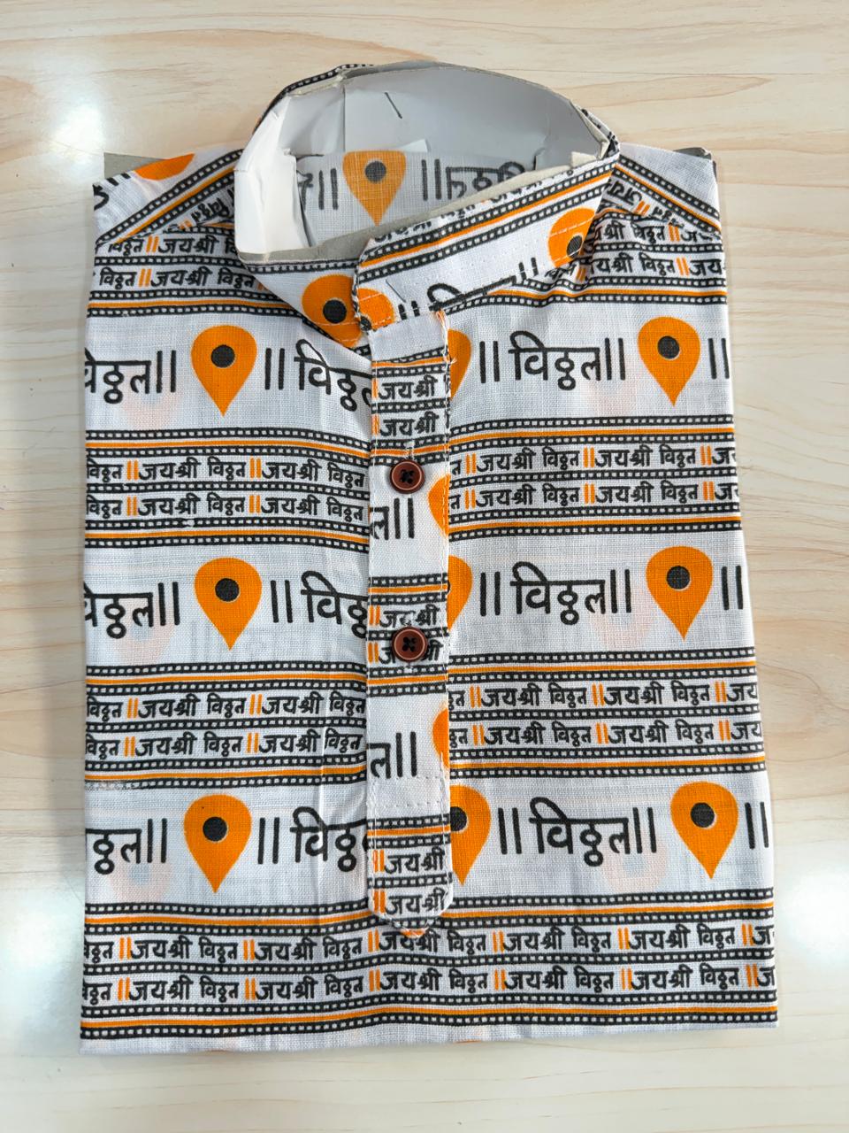 + Free ShippingStylish printed cotton shirt featuring a unique Vitthal (विठ्ठल) name print with modern location-pin motifs. Designed on a soft light-grey base with attractive orange and black highlights, this shirt blends traditional devotion with a contemporary look. Comfortable fabric and eye-catching print make it ideal for daily wear, Wari events, bhajan programs, and casual outings.